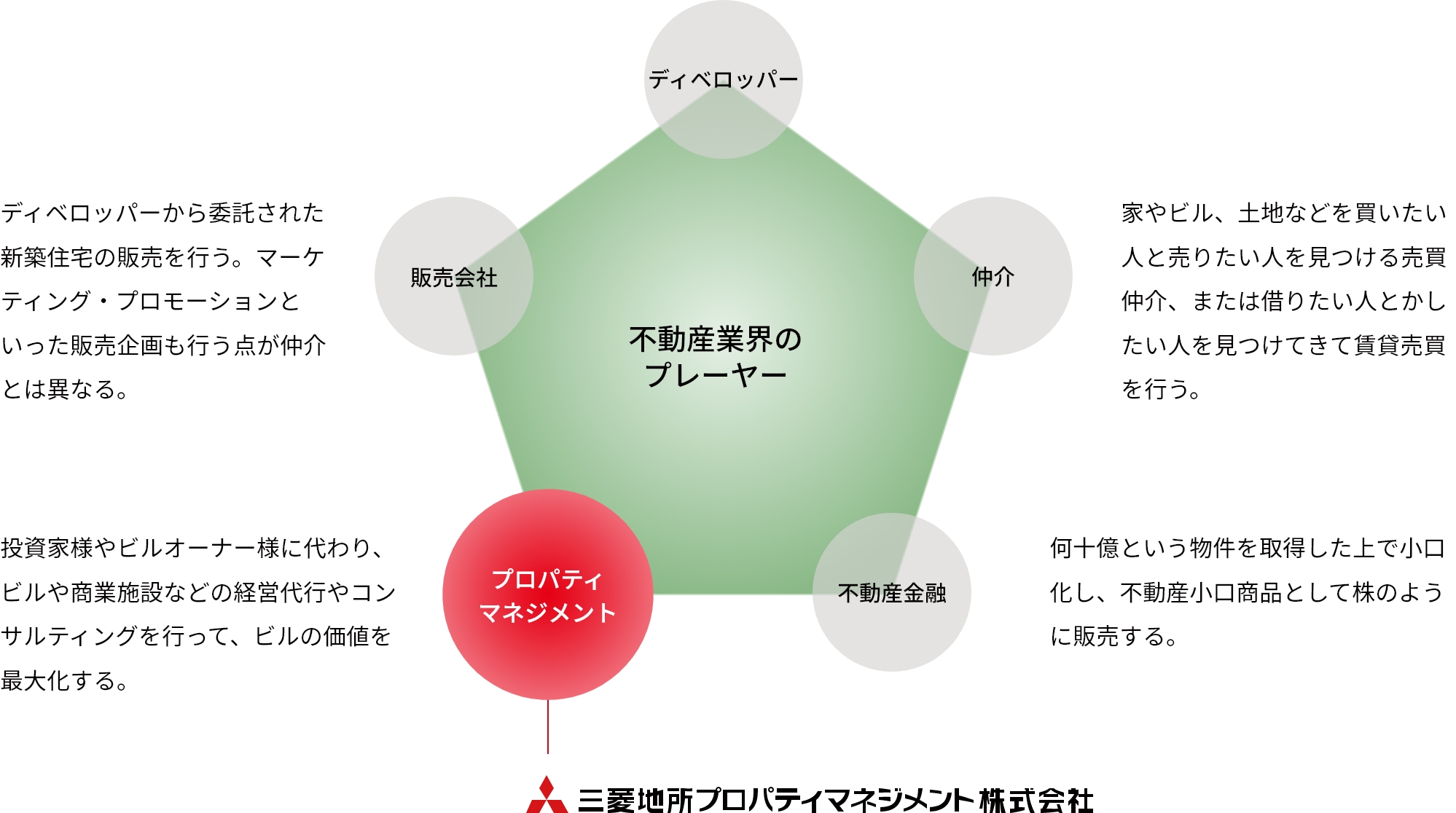 三菱地所グループでは、オフィスビルや住宅、商業施設をはじめとした不動産開発を通じた街づくりを行っています。ビルや住宅の開発だけではなく、その後の運営管理やリフォーム、不動産流通など、その事業は多岐に亘り、専門的な機能を持つグループ会社がそれぞれの役割を担っています。MJPMでは三菱地所グループの総合力を基に、オーナー様、テナント様の不動産に関するあらゆる課題解決をお手伝いし、オフィスビルや商業施設、そしてエリア全体の新たな価値の創造に取り組んでいます。