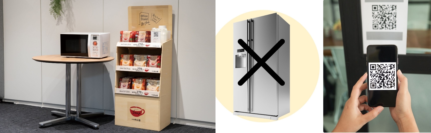 レトルト商品なので常温で保管が可能です。冷蔵庫や冷凍庫など電源不要で、オフィスでご用意いただくのは電子レンジだけ。設置に必要な什器やスープカップ、スプーンなどの備品もすべてお届けします。全国どこでも導入可能で、小規模オフィスにもコンパクトに設置できます。賞味期間は製造日より1年間で、出荷日を含め3カ月以上のものをお届けします。商品を数日で消費する必要はなく、年末年始やゴールデンウィークなど長期休みの間の商品管理の心配もありません。日常は社食として活用しながら、有事には防災備蓄として役立てられるローリングストックの仕組みとして導入されている企業様もいらっしゃいます。また、キャッシュレス決済で現金管理が不要です。利用は❶選定、❷QRコードの読み込みによる決済、❸電子レンジで90秒の温めのたった3ステップ。担当者様の手間を減らし、従業員様の利便性を叶えることで食の選択肢の拡充を実現します。