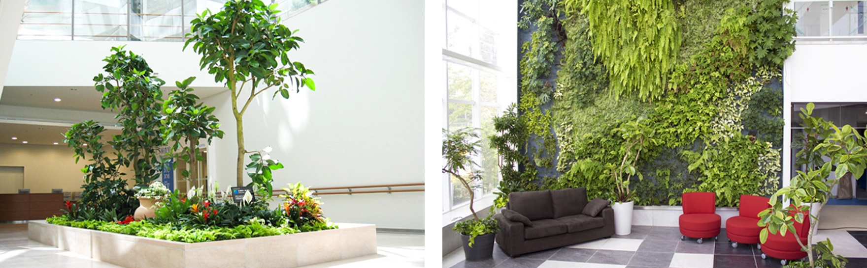 弊社の室内緑化は、環境美化や高いデザイン性と共に「空気をきれいにすること」をコンセプトとして開発され、全国の公共空間で導入されています。オフィスに置きましてもそこで培ってきたノウハウをベースに働く環境の向上を目的としてご利用いただいております。また、導入先で活躍し樹勢が弱まった植物は、自社の温室で養生して回復させた後、再利用する植物のリサイクルにも力を入れており、環境への配慮と共に、サスティナブルな緑に囲まれたオフィス空間をお届けします。
