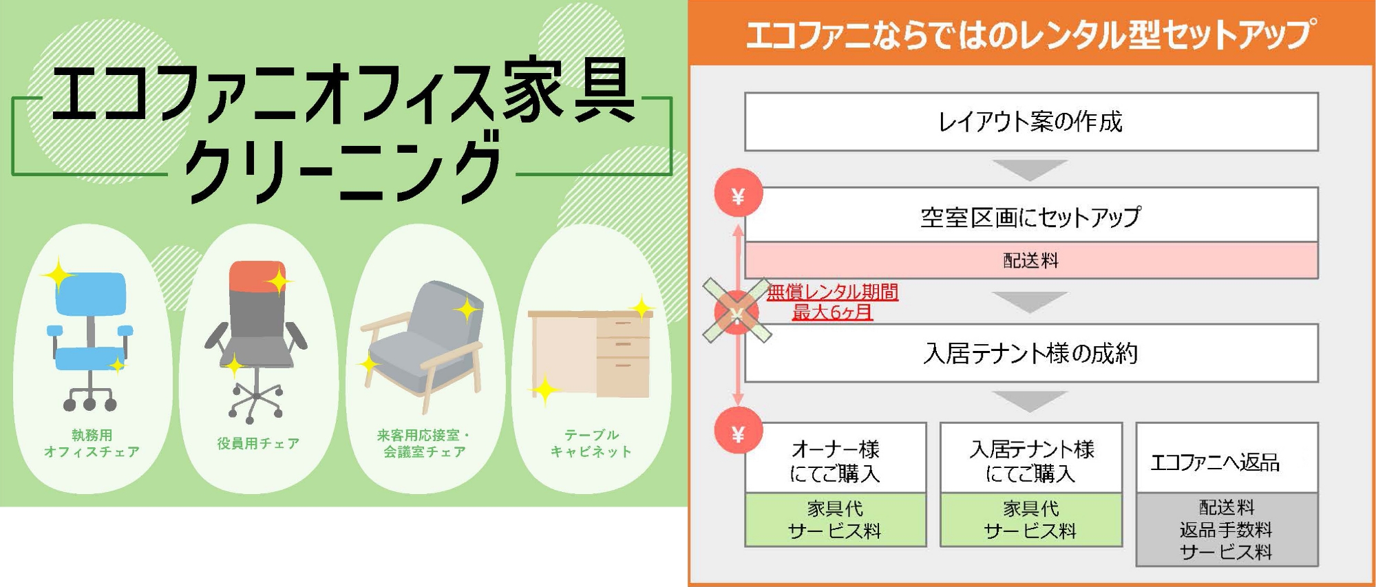 初期費用(配送費・設置作業費等)のみでオフィス家具什器の6か月無償レンタルいたします。